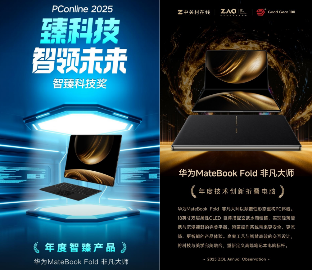 在专业评价层面,太平洋科技授予华为MateBook Fold 非凡大师“年度至臻产品”称号,称其以突破性折叠形态与极致工业设计,为PC行业注入久违的创新活力;中关村在线则授予其“年度技术创新折叠电脑”大奖,高度肯定其在形态革新与智慧体验上创新。