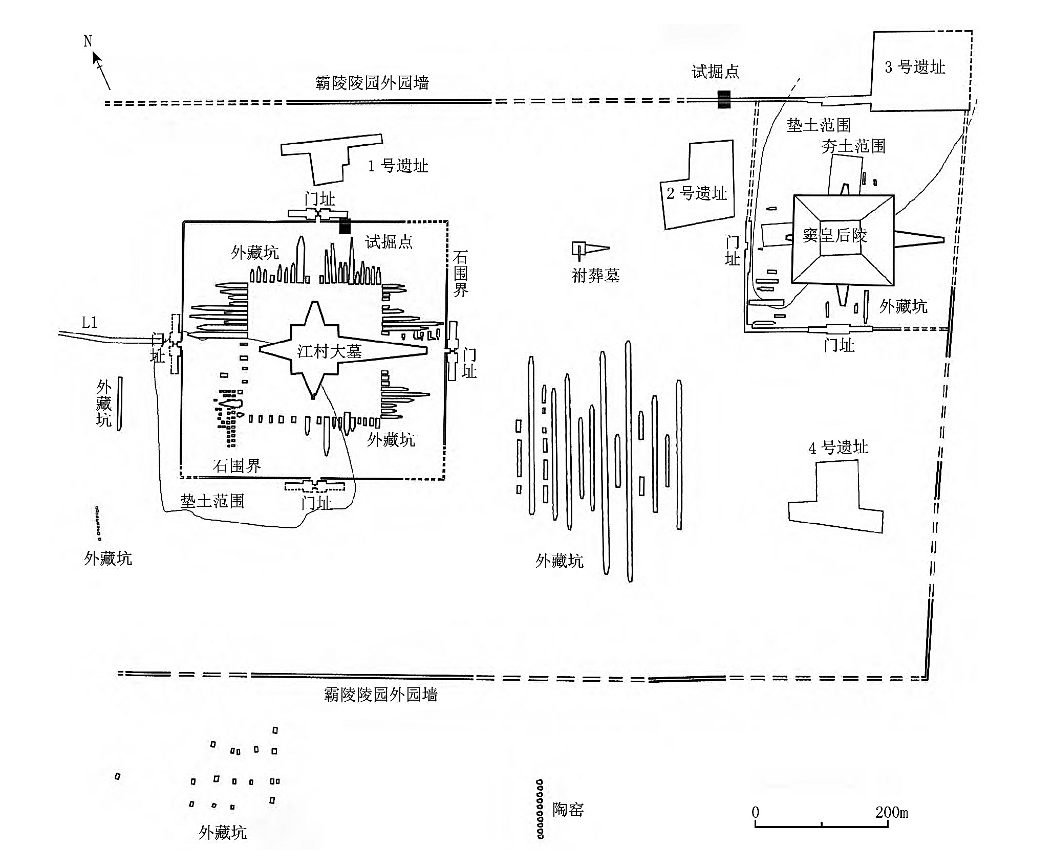 但随着考古发现,越来越多的证据表明,江村大墓才是汉文帝霸陵所在地。2019年,考古队发现窦皇后陵和江村大墓的外围有更大范围的陵园园墙遗存,说明江村大墓与窦皇后陵同处一个大陵园,符合西汉帝后合葬的“同茔异穴”葬制,成为确认汉文帝霸陵的关键性证据。汉文帝霸陵位置的确认,纠正了讹传之误,其对于文景之治研究的历史价值也毋庸置疑。