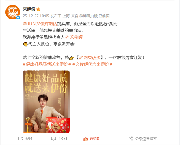 来伊份方面在接受采访时表示:“文俊辉在年轻消费者中的号召力,能够帮助品牌更有效地触达目标客群,提升品牌在Z世代中的渗透率。同时,他对事业的专注与追求,也与来伊份二十余年坚守品质、持续创新的企业精神相呼应。”