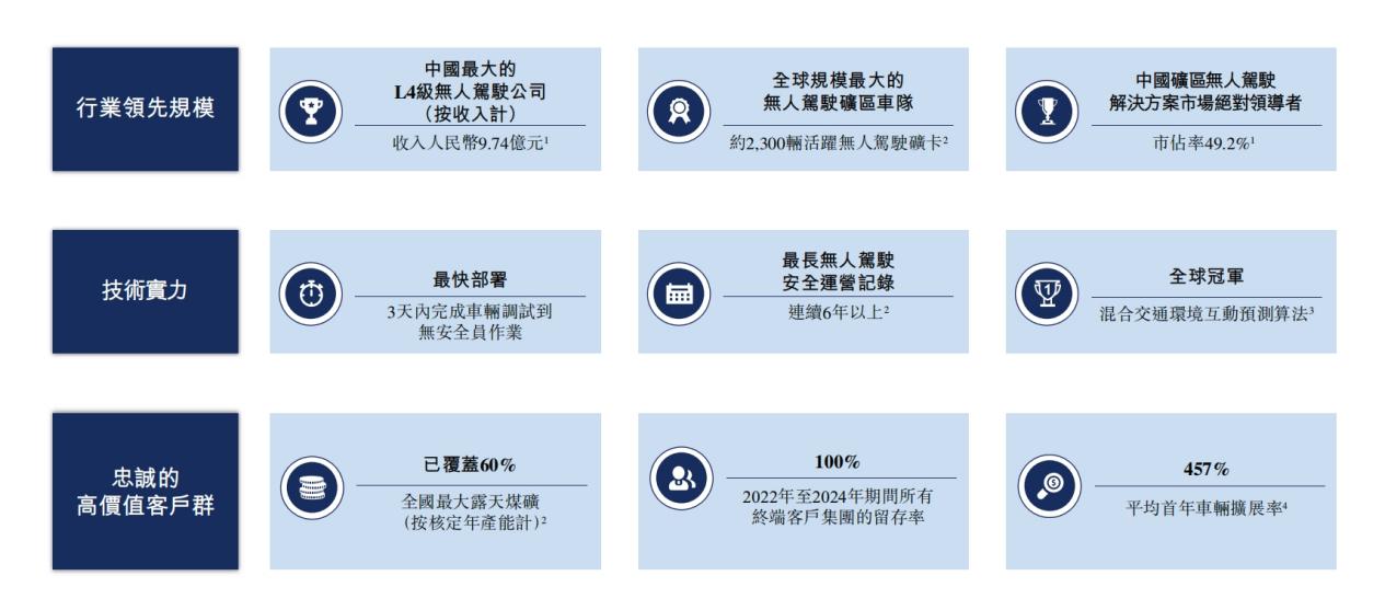 2024 年,公司实现总收入9.86亿元,在中国所有L4级无人驾驶公司中排名第一;同时,公司是中国最大的矿区无人驾驶解决方案提供商,在该市场份额约为 49.2%;而按同期收入计,中国作为全球最大的L4级矿区无人驾驶解决方案市场,其全球市占率超过40.5%。