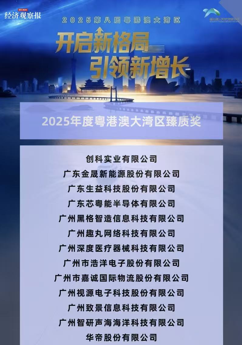 论坛同期,经济观察报发布“2025年度粤港澳大湾区臻质奖”名单,华帝股份凭借其卓越表现,成功摘得此项殊荣,成为厨电行业唯一获奖的企业,也成为高质量发展的典范代表。