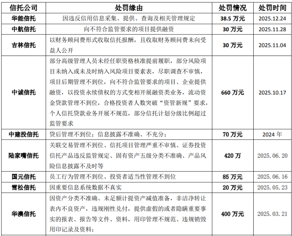 事实上,不仅是2025年,2024年多家信托公司也因类似问题受到处罚。