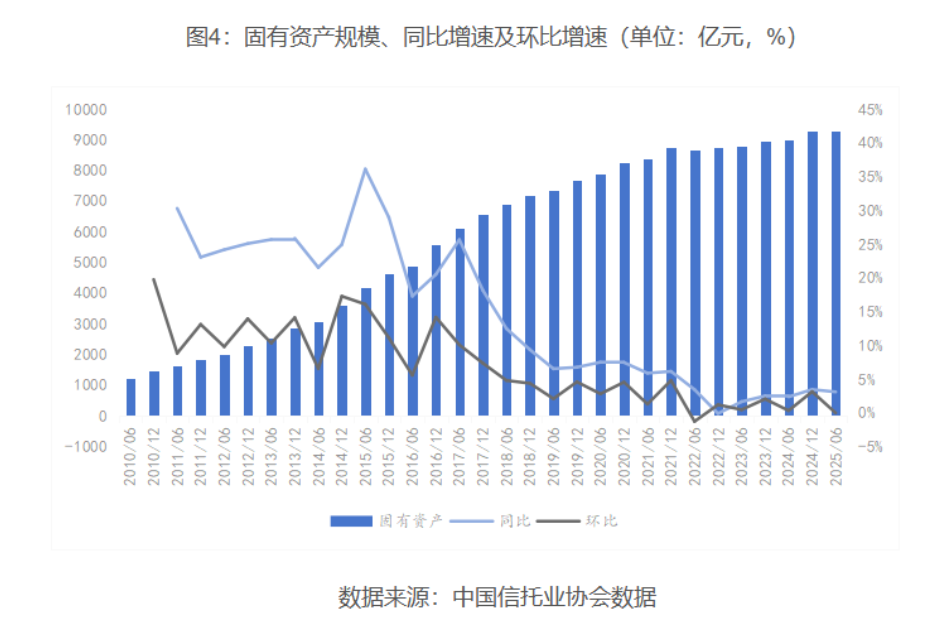 另外,中国信托业协会最新数据显示,2025年上半年,全行业固有资产与所有者权益继续保持小幅增加态势,其中固有资产规模为9264.33亿元,与2024年同期相比增长3.08%;所有者权益规模为7721.8亿元,较2024年同期增长2.22%。