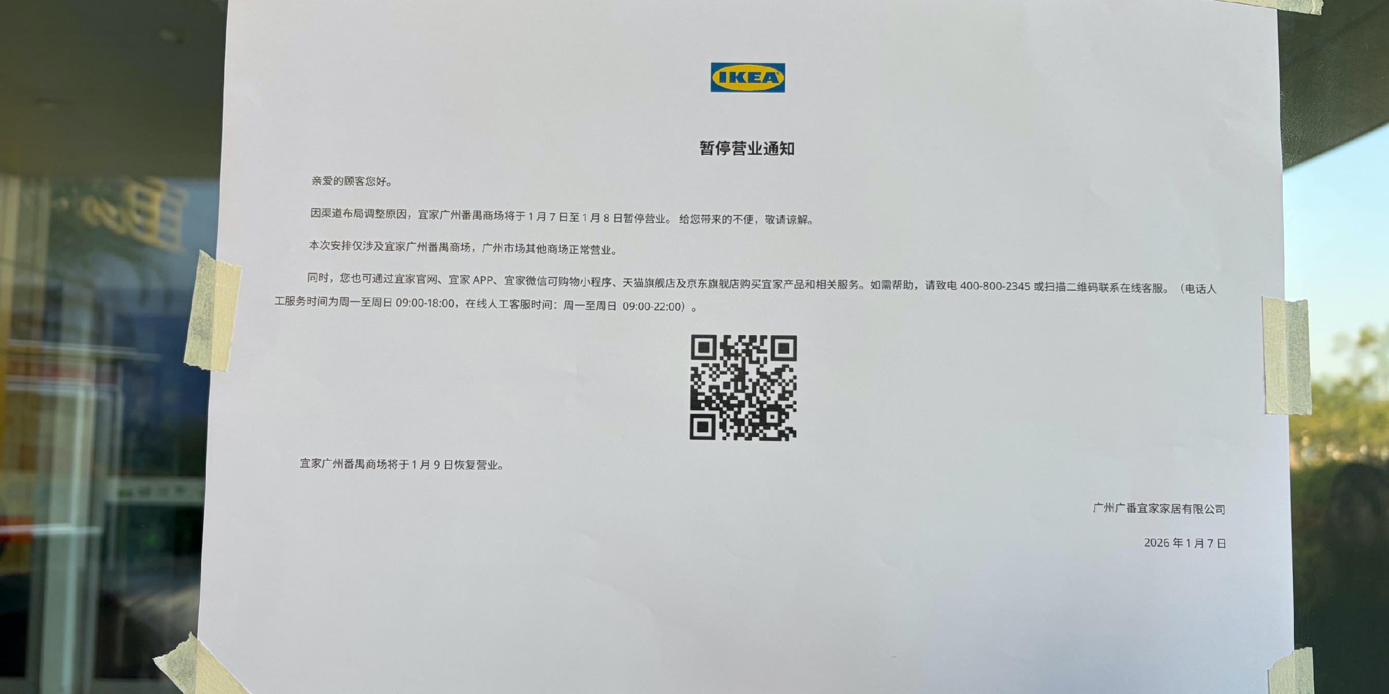 1月7日,家居零售企业宜家中国通过官方微信及官网发布《以韧性构建未来 宜家中国关于调整门店布局的说明》(下称《说明》)称,决定自2026年2月2日起停止运营包括宜家上海宝山商场、宜家广州番禺商场等七个线下门店。