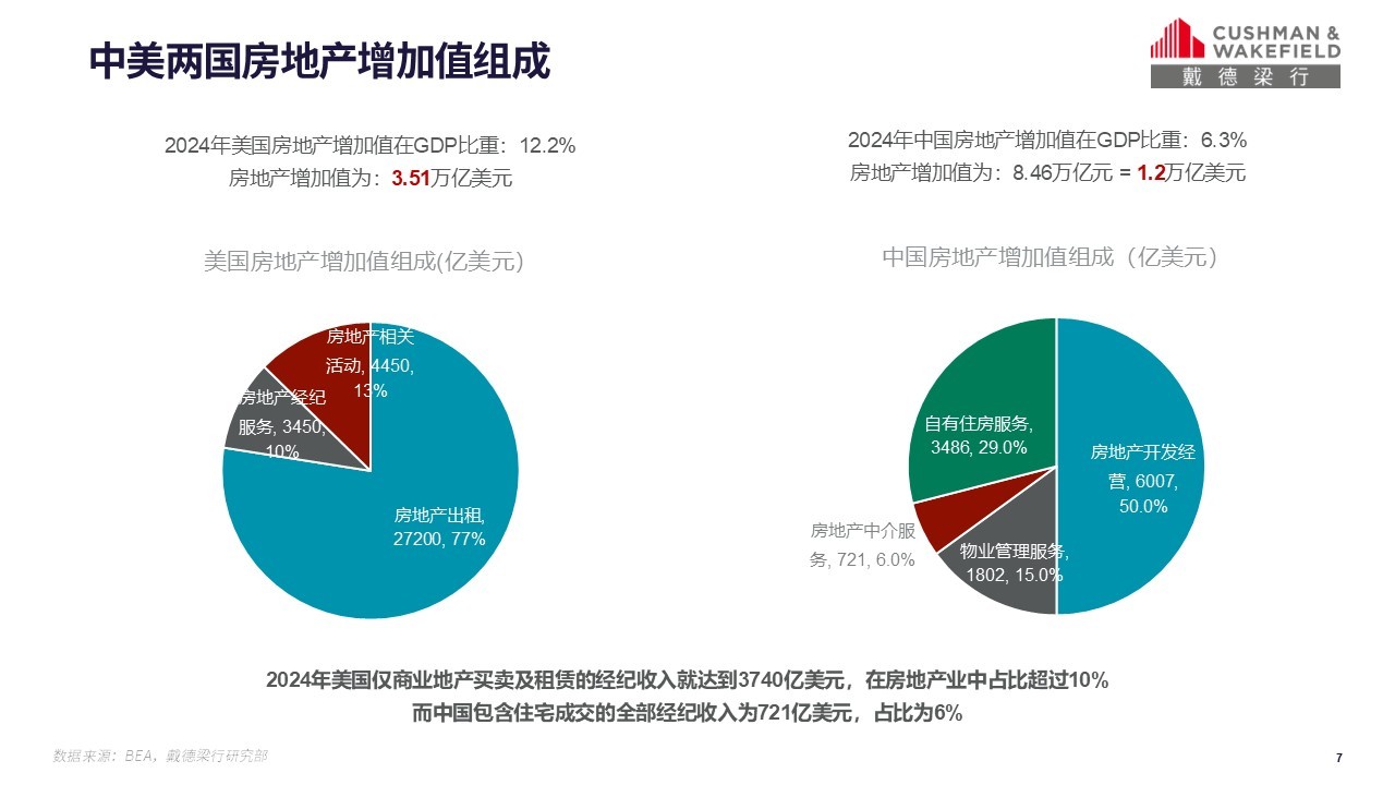 同时,我们认为,未来商业地产在房地产行业中所扮演的角色也将越来越重要。对比中美两国房地产增加值的构成,我们可以看到,2024年美国房地产增加值为3.51万亿美元,是中国的近3倍,其中美国的住房服务在其中占比达到77%,其住房服务涵盖的内容包括房地产出租,房地产经纪服务,房地产相关活动,这其中,商业地产的租赁及买卖占比超过10%,2024年实现增加值3740亿美元。而在中国,2024年中国50%的增加值仍来自于房地产开发,自有住房服务占比为29%,其余两项为物业管理服务(15%)和房地产中介服务(6%),商业地产服务并没有做出细分,这也可能说明商业地产在房地产行业中扮演的角色依然较弱,同成熟市场相比具有很大差距。