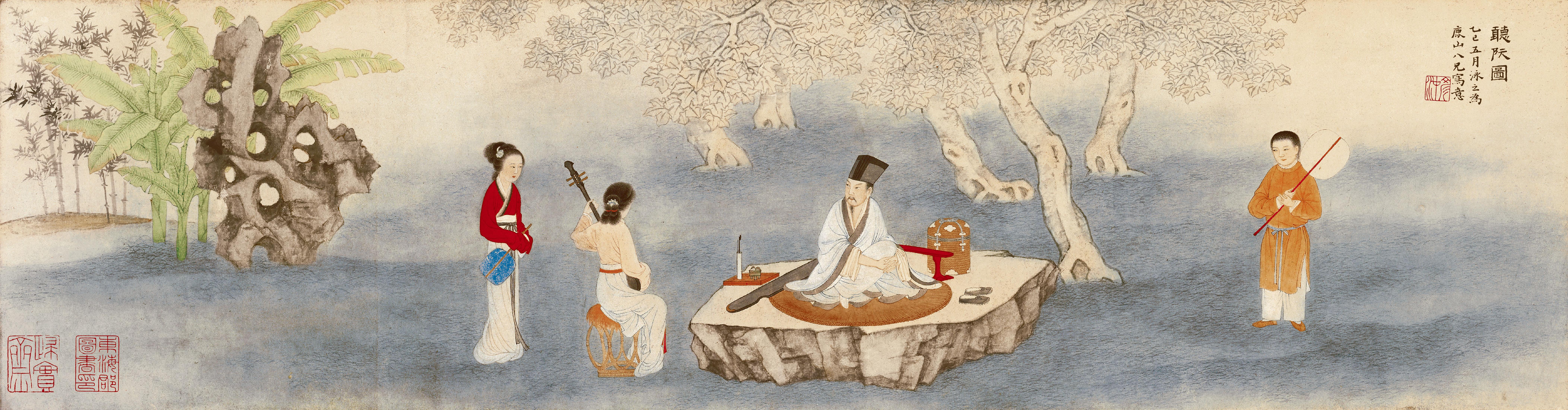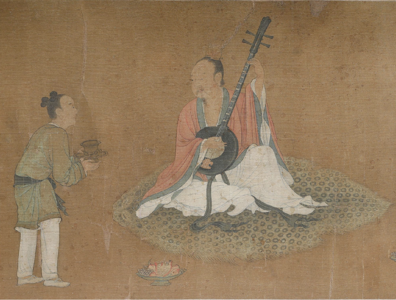 值得注意的是这件阮咸的捍拨部分。捍拨位于琴腹,是保护拨弦处的装置。该捍拨以八瓣红色花朵为背景,中间描绘的是三位在林间弈棋的隐士。琴腹偏上部一左一右有两处小圆,颜色已经脱落,内容难以识别。学者通过红外线扫描,可以确认其本来绘制的是月宫树下的蟾蜍和玉兔。月光清幽,松竹掩映,伴着阮咸的绵绵清音,我们仿佛亲眼见证了千年前的名士风流。