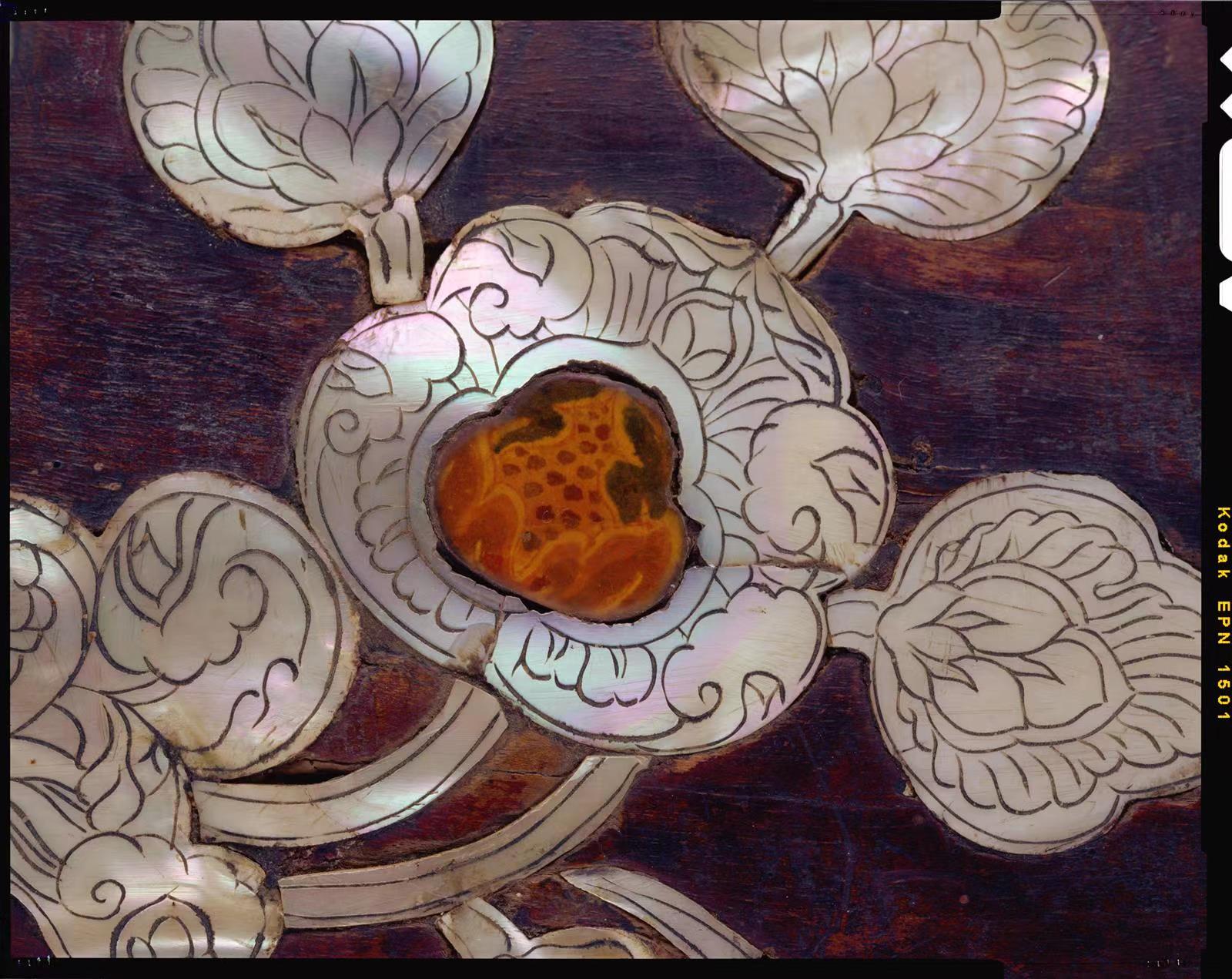 正仓院收藏的琵琶等乐器往往也用精致绝伦的螺钿工艺来装饰。这件琵琶的背面,亦即所谓的“槽”,遍身螺钿填嵌出各式姿态可喜的花、鸟、流云。而螺钿花心的彩色宝石,则是先在宝石上绘出花纹,再行镶嵌,工艺之精巧令人叹为观止。因此观赏这把琵琶,能同时欣赏到极为罕见的唐代设色山水绘画与螺钿工艺,称为“绝品”当属名副其实。