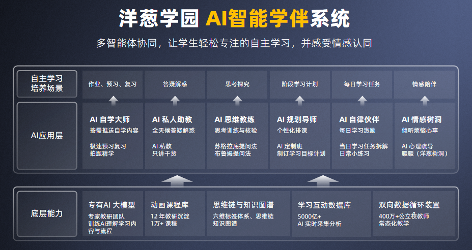 面对传统教育中统一化教学与个性化需求的矛盾、教师重复性劳动负担重、学生自主学习能力培养不足等痛点,洋葱学园以 AI 技术深度融合教育场景,构建覆盖 “学生个体 — 学校课堂” 的自主学习新模式,推动教育从 “知识传授” 向 “能力培养” 转型。