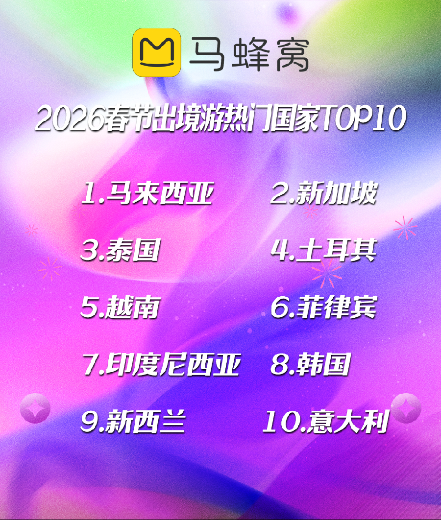 超长假期同样带动了出境长线游热度增长。马蜂窝数据显示,春节出境游热门国家前十为马来西亚、新加坡、泰国、土耳其、越南、菲律宾、印度尼西亚、韩国、新西兰、意大利。其中,意大利因米兰冬奥会举办时间与春节重合,吸引不少游客计划“观赛+旅行”,马蜂窝站内相关签证、租车攻略热度上涨170%。
