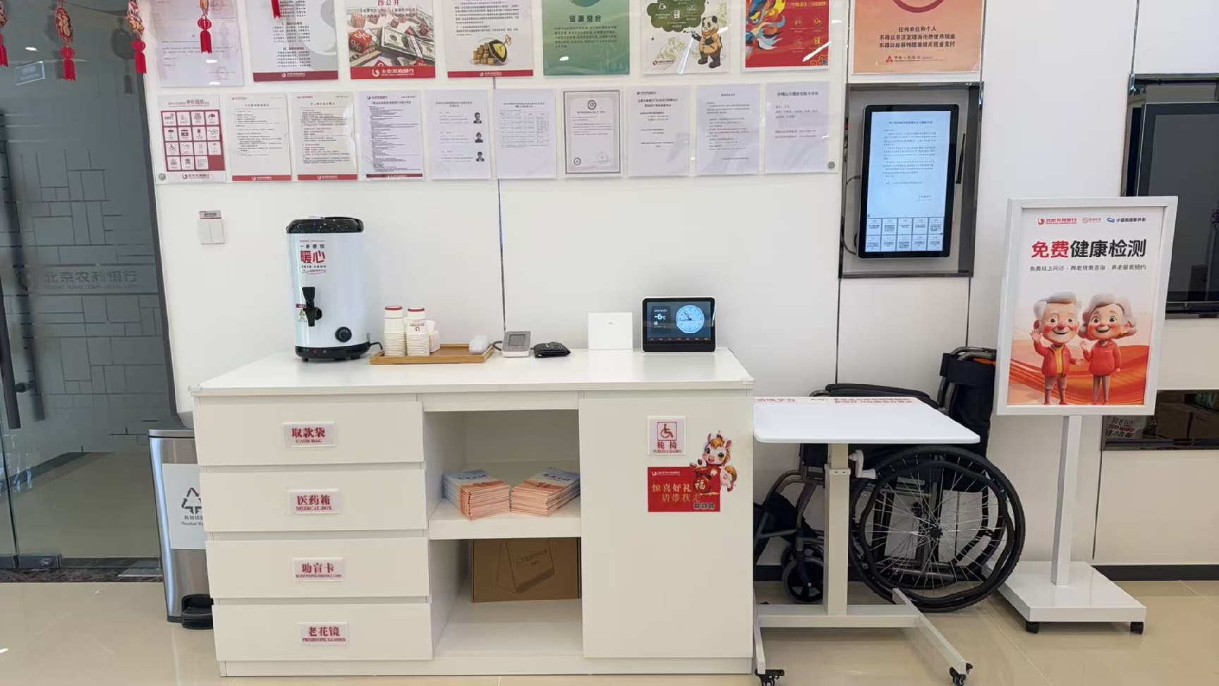 经过适老化改造的网点不仅设置了无障碍通道、爱心座椅、轮椅等适老设施,还配备了血压仪、医药箱、老花镜等便民设备,让老年客户的每一次到访都能感受到家的温暖。