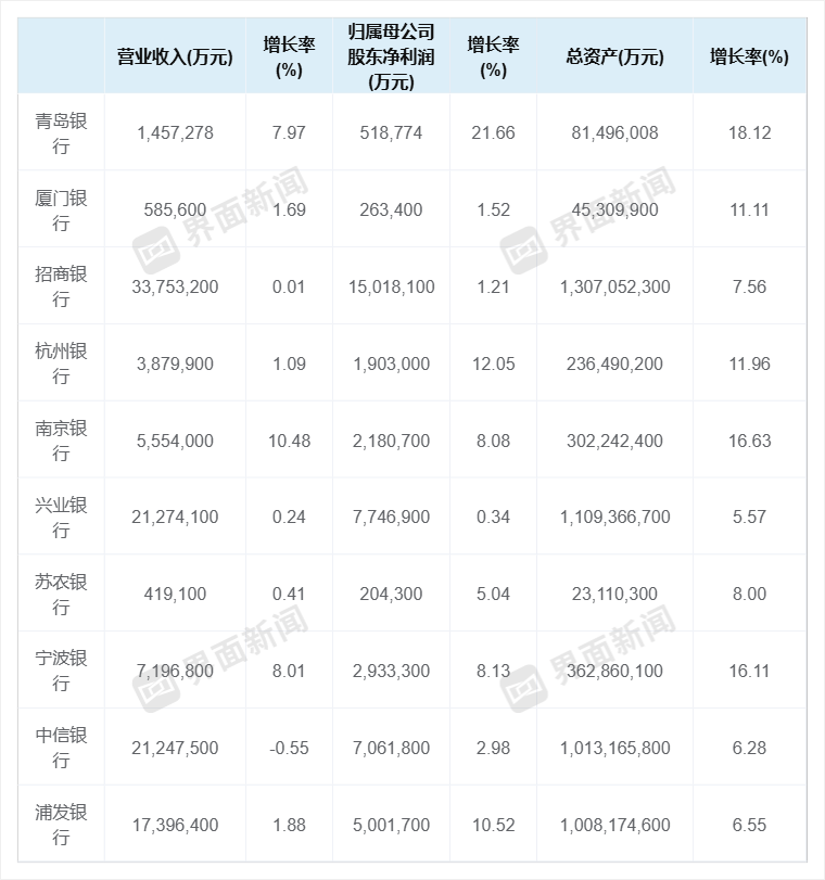 从披露的数据来看,在利率下行、息差收窄的行业大环境下,这10家银行整体呈现稳健发展态势,全部实现归母净利润正增长,9家达成营业收入与净利润“双增”。