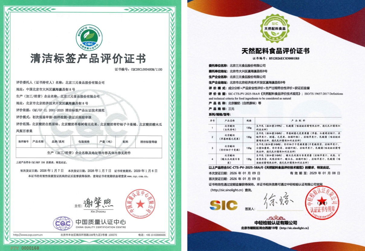 三元食品的第二款大单品——北京酸奶身上有个显著的标签,即中国质量认证中心(CQC)颁发的清洁标签0级评价与中轻检验认证有限公司(SIC)颁发的天然配料食品评价。