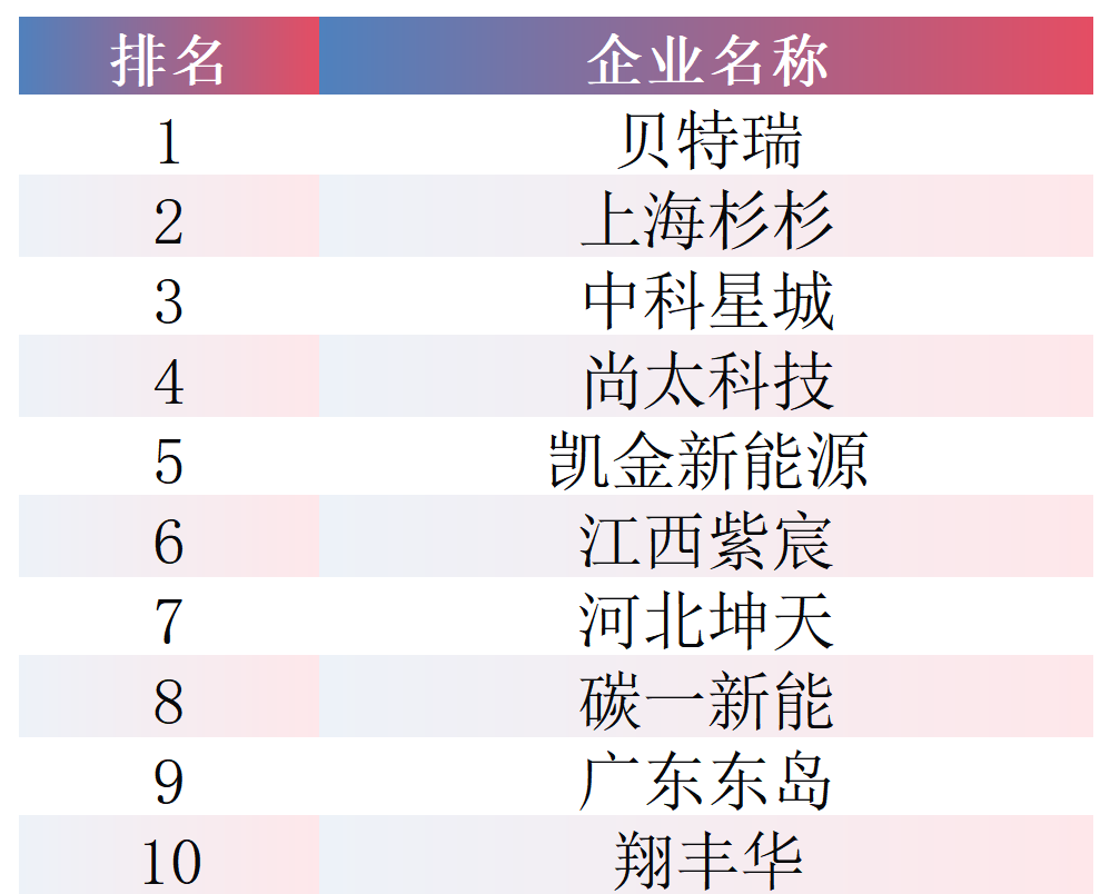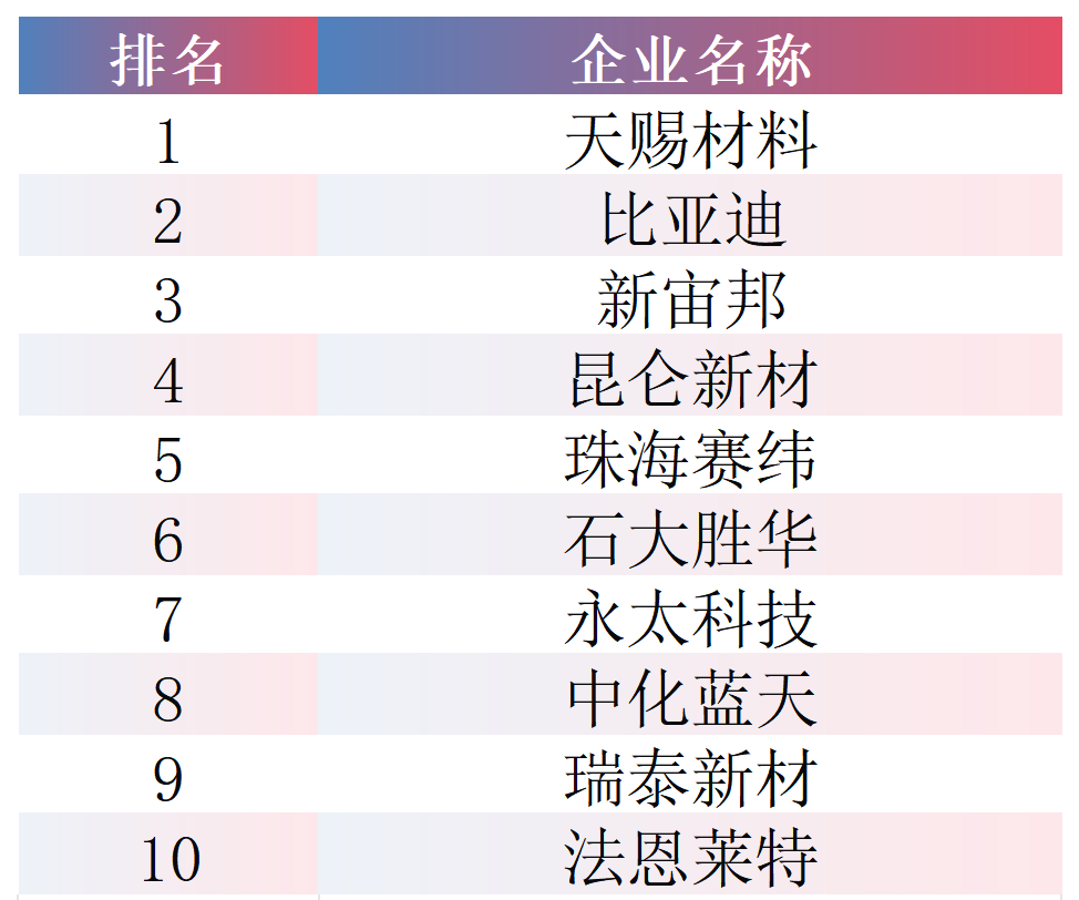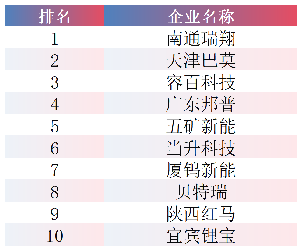 2025年,中国三元材料出货量达78.6万吨,同比增长22.2%。其出货量前十企业分别为:南通瑞翔、天津巴莫、容百科技、广东邦普、五矿新能、当升科技、厦钨新能、贝特瑞、陕西红马、宜宾锂宝。榜单中,南通瑞翔凭借稳定出货量接近20万吨,登顶该赛道榜单首位;天津巴莫排名同比跃升,位列第二;容百科技排名有所下滑,降至第三位。