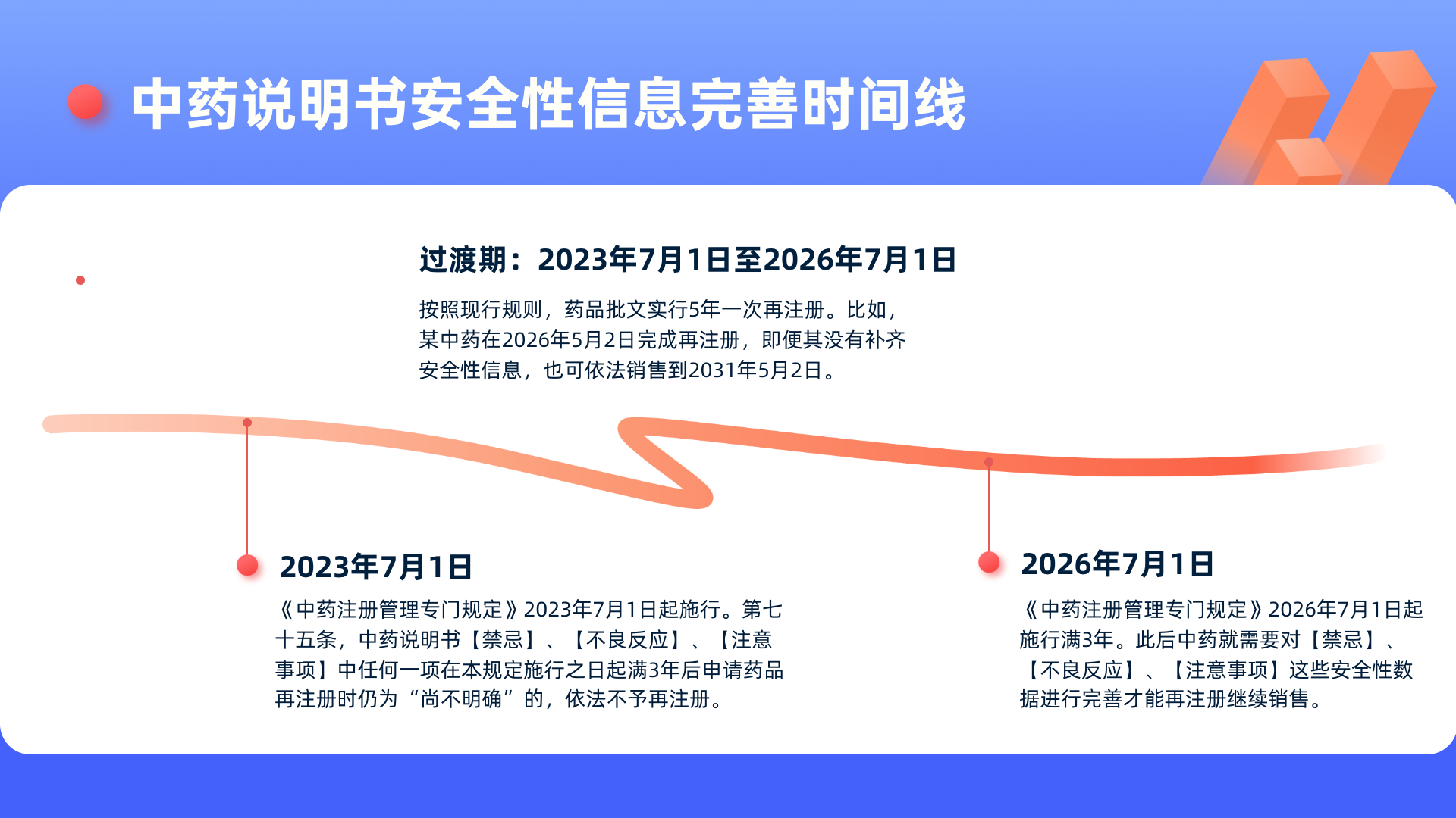 该规定自2023年7月1日起施行,设置三年窗口期。按照规定,凡中成药说明书中,【禁忌】【不良反应】【注意事项】任意一项仍标注为“尚不明确”的,在过渡期结束后,再次提出注册申请时,将依法不予通过。