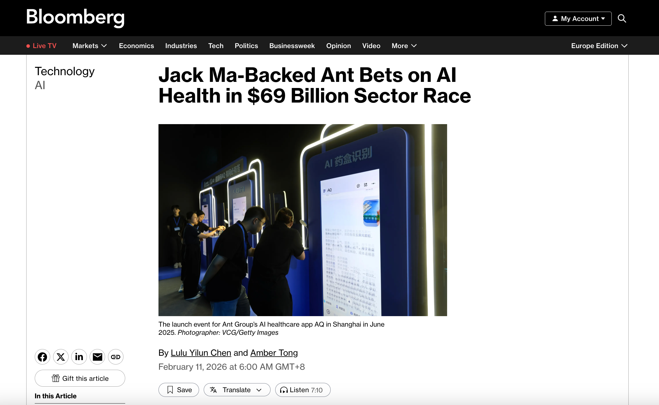 “健康福”的出圈,是蚂蚁集团 AI 战略向医疗健康领域延伸的具象化落地。据彭博社报道,蚂蚁正将AI医疗健康作为下一阶段增长的核心引擎,并已跻身中国最大的医疗AI投资者之列。内部架构上,健康业务已被提升至与支付、金融并列的战略层级。