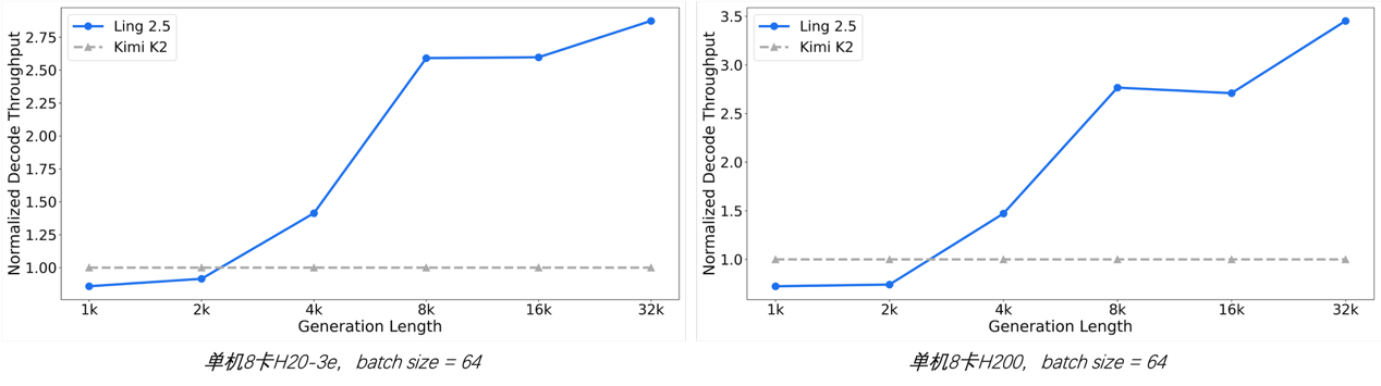 Ring-2.5-1T基于Ling 2.5架构,通过优化注意力机制,显著提升长文本推理的效率与稳定性。模型激活参数规模从前代的 51B 提升至 63B,但在混合线性注意力架构的支持下,推理效率相比上一代大幅提升。与仅具备 32B 激活参数的KIMI K2架构相比,在1T总参数量下,Ling 2.5架构在长序列推理任务中的吞吐表现依然优势显著,且随着生成长度增加,效率优势持续扩大。