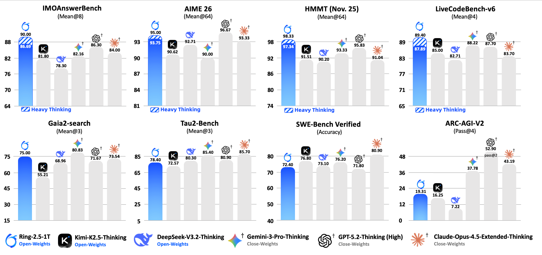 在多项权威基准测试中,Ring-2.5-1T 与 DeepSeek-v3.2-Thinking、Kimi-K2.5-Thinking、GPT-5.2-thinking-high、Gemini-3.0-Pro-preview-thinking-high、Claude-Opus-4.5-Extended-Thinking 等主流开源与闭源模型进行了系统对比,在数学推理、代码生成、逻辑推理和智能体任务执行等高难场景中达到开源领先水平。尤其在深度思考(Heavy Thinking)模式下,该模型在IMOAnswerBench、HMMT-25等数学竞赛推理基准和LiveCodeBench-v6代码生成基准中超越所有对比模型,展现了强大的复杂推理与跨任务泛化能力。