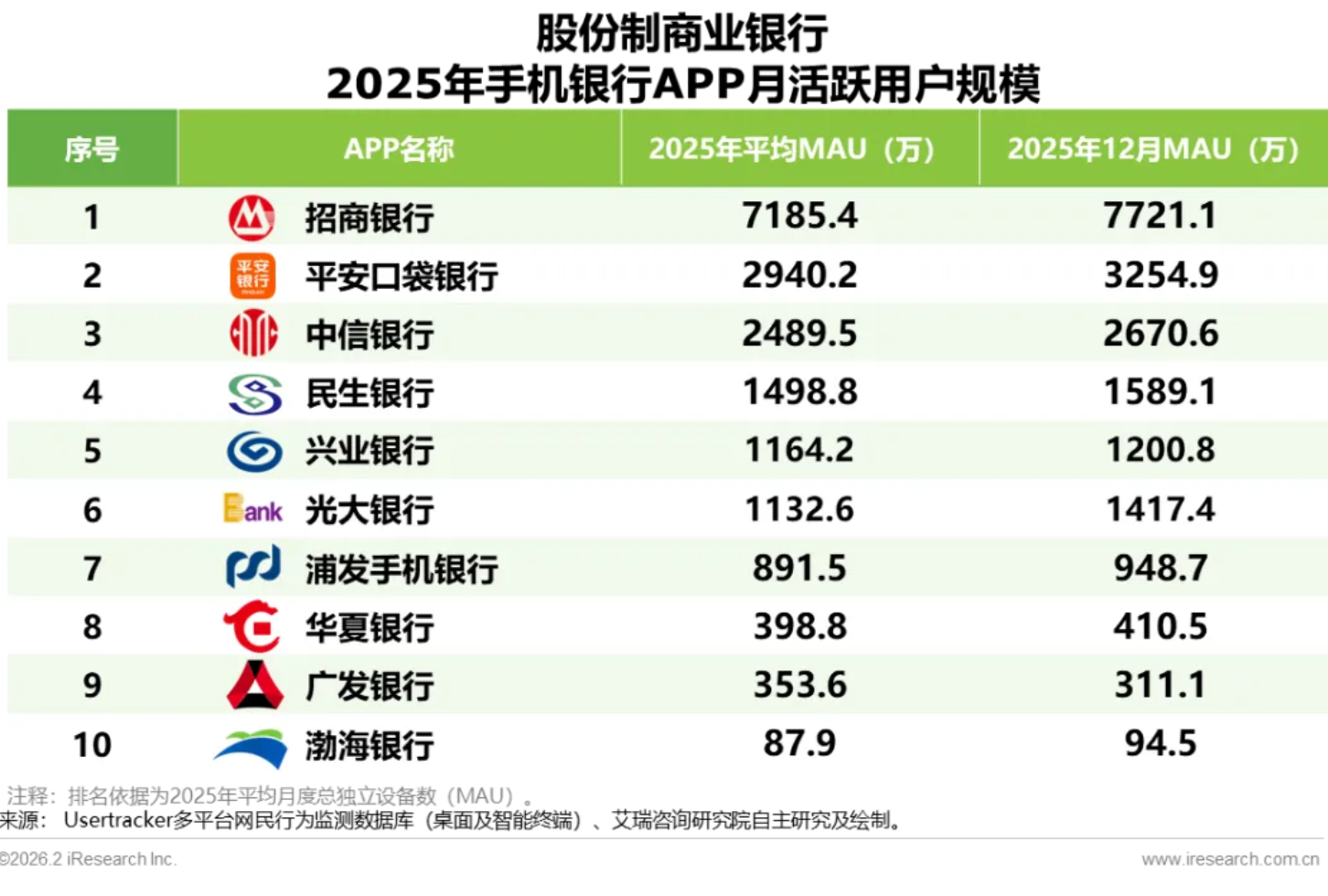 相较于国有大行的“大而全”,股份制商业银行在存量博弈中选择了“专而精”的差异化生存路径。然而,头部效应显著,尾部机构生存空间日益逼仄。招商银行以7185.4万MAU遥遥领先,稳居股份制银行首位,甚至超越了部分国有大行,报告成功源于在财富管理与智能交互领域的长期深耕。