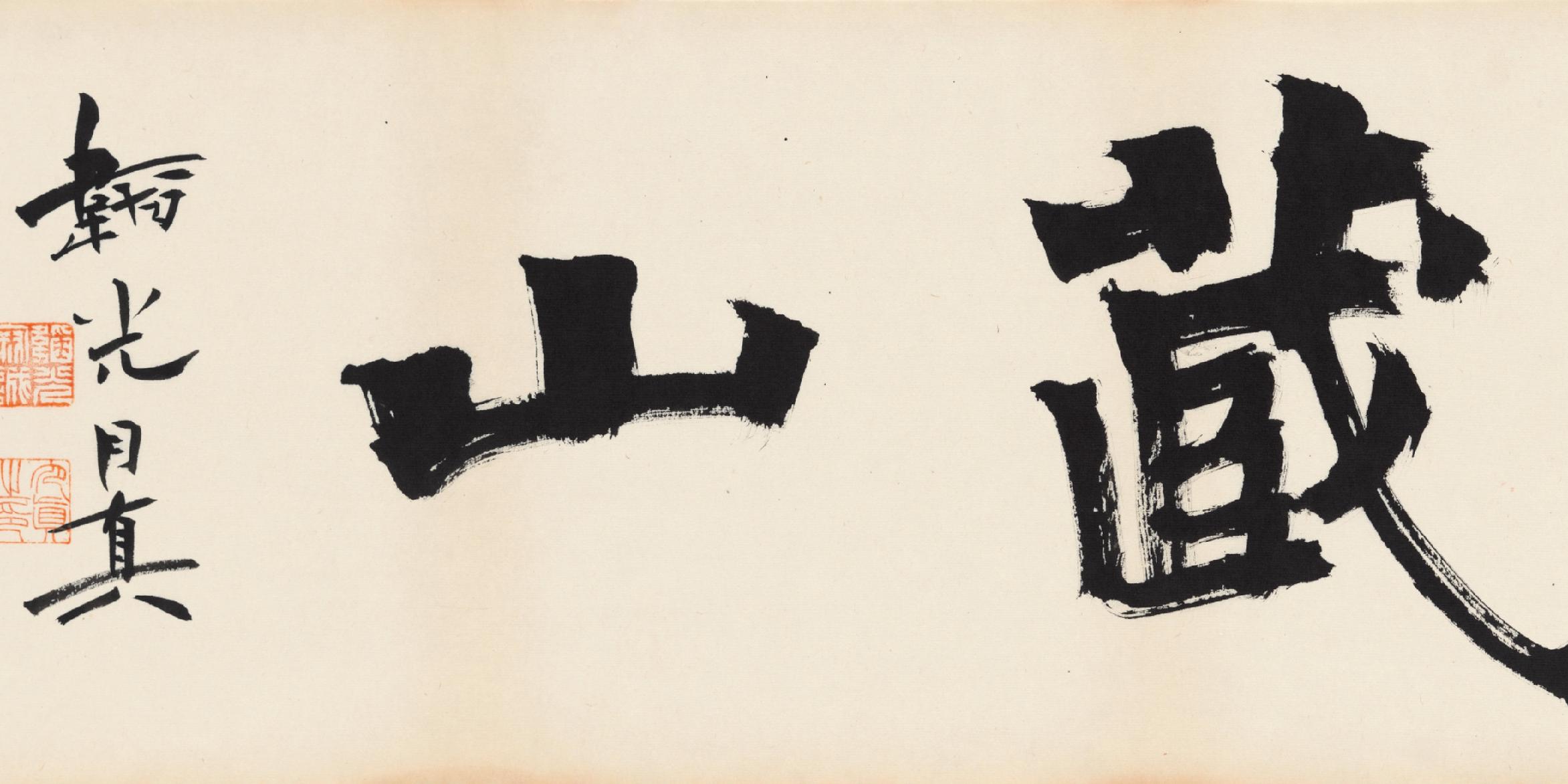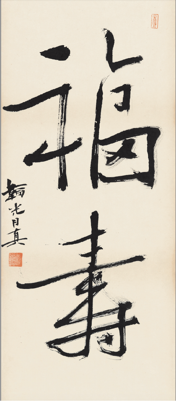 “拂尘”二字笔意轻盈而内含骨力,墨色枯润相间,恰似拂尘过处,痕迹犹存却已无挂碍。“福寿”二字构图新颖:“福”字敦厚如老僧入定,“寿”字舒展似古松探崖,兼收隶书之端雅、魏碑之拙强。“梅溪”二字笔墨间仿佛能嗅到溪水的冷香、梅花的清芬。二字点画如溪中卵石,自然天成;结构似寒梅横斜,疏影暗香。“藏山”二字笔势内敛而气象非常。“藏”字如巨岳敛形,“山”字似孤峰兀立,似将万壑松风藏于笔底,把千年禅意凝入墨中。看似沉静,细品却有山川回响、天地呼吸。