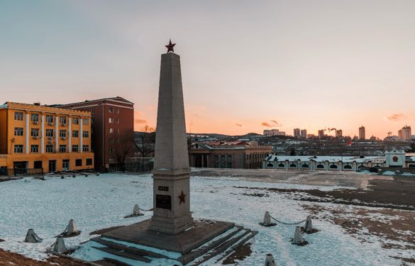 绥芬河火车站站前广场的苏联红军解放纪念碑。 王雅洁/摄。