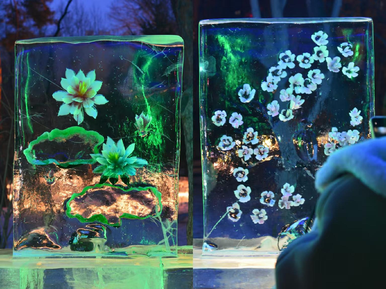 从公园南门入园,经过以“源”为主题的冰雕,映入眼帘的便是冰雕长廊,以花朵入冰,氛围感十足;马年元素的冰雕灵动鲜活,寓意丰富,如一马当先、马到成功、马上有钱花等引得游客争相打卡。