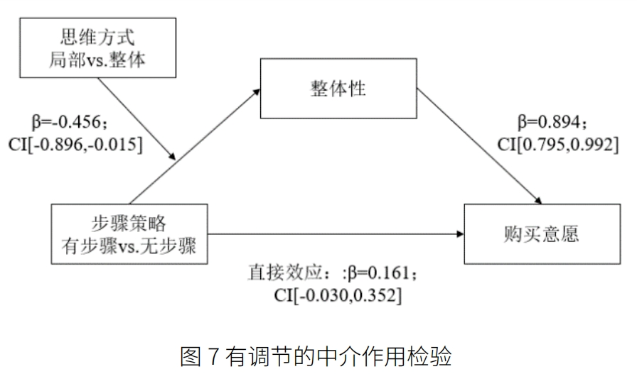 有 调 节 的 中 介 作 用 分 析。参 照 Preacher 和 Hayes(2004) 与 Hayes(2013) 提 出 的 Bootstrap 方 法 进 行中介效应检验(Model 7,5000 Samples,95%CI)。结果显示,步骤策略和思维方式的交互效应显著影响消费者对 商 品 整 体 性 的 感 知(β=-0.456;CI[-0.896,-0.015]),同时感知整体性显著影响消费者对捆绑组合的购买意愿(β=0.894;CI[0.795,0.992])。对于局部思维方式的消费者来说,步骤策略通过整体性显著影响购买意愿(β=0.407;CI[0.127,0.712]),对于整体思维方式的消费者来说,整体性的中介作用不显著(β=0.000;CI[-0.282,0.264])。结果验证了假设 3,详情请见图 7。