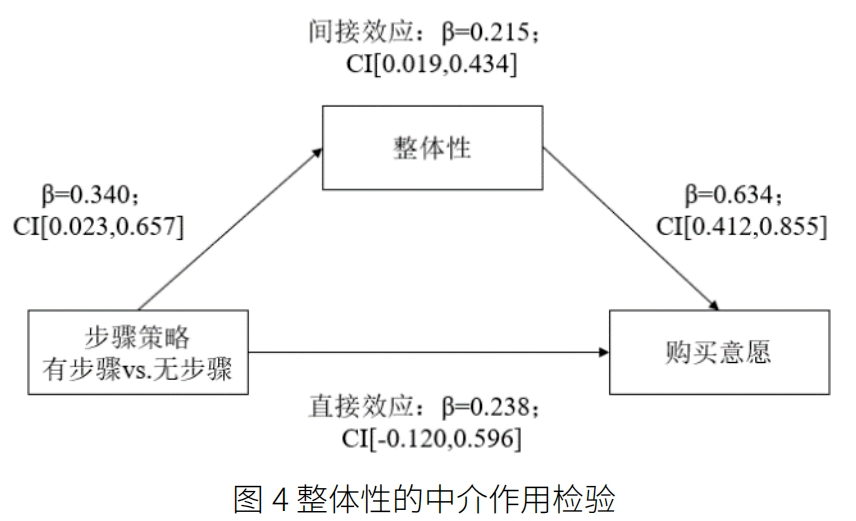 中介作用分析。为进一步检验感知整体性在步骤策略和购买意愿之间的中介作用,按照 Zhao 等(2010)提出的中介效应分析程序,参照 Preacher 和 Hayes(2004)与 Hayes(2013)提出的 Bootstrap 方法进行中介效应检验(Model 4,5000 Samples,95%CI)[31][32][33]。结果如图4 所示,整体性中介了步骤策略对消费者购买意愿的影响(β=0.215;CI[0.019,0.434]),验证了假设 2。