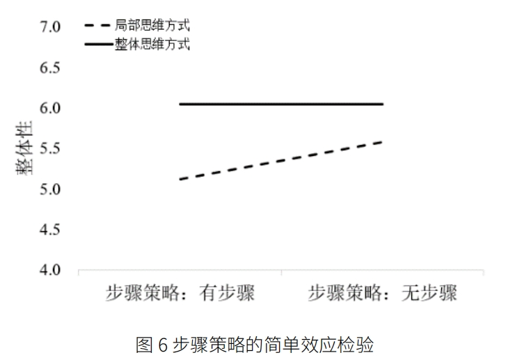 步骤策略的简单效应分析。对步骤策略的简单效应分析发现,对于局部思维方式的消费者而言,无步骤组的感知整体性显著高于有步骤组(M 有步骤= 5.12 vs. M 无步骤= 5.58),F(1,257)=8.25,p=0.004。对于整体思维方式的消费者而言,有无步骤信息不显著影响感知整体性(M 有步骤= 6.05 vs. M 无步骤= 6.05;F<1)。详情请见图 6。