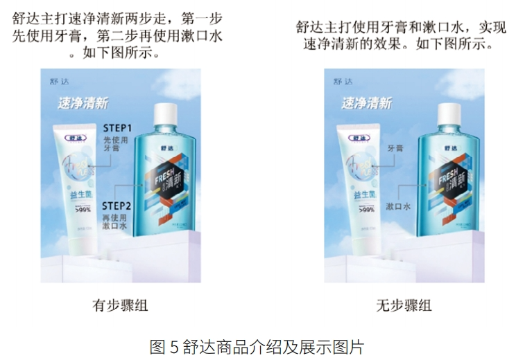 实验二同样采用了单因素(步骤策略:有步骤 vs. 无步骤)被试间实验设计,参与者被随机分配到一种情景。我们更换了商品品类,让虚拟品牌“舒达”推出了牙膏和漱口水的捆绑组合,随即呈现商品介绍及商品展示图片。有步骤组的商品介绍为:“舒达主打速净清新两步走,第一步先使用牙膏,第二步再使用漱口水”。无步骤组的商品介绍为:“舒达主打使用牙膏和漱口水,实现速净清新的效果”。在有步骤组的商品展示图片中,呈现“STEP1 先使 用牙膏”和“STEP2 再使用漱口水”的步骤信息,在无步骤组的商品展示图片中,通过 PS 技术将步骤信息消除。实验材料如图 5 所示。