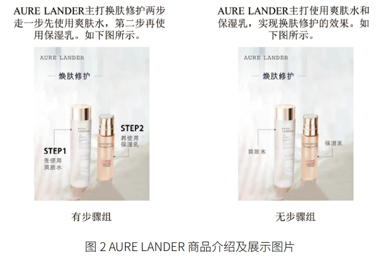 实验一采用了单因素(步骤策略:有步骤 vs. 无步骤)被试间实验设计,参与者被随机分配到一种情景。我们创建了一个虚拟的品牌“AURE LANDER”,参与者要求想象在浏览商品过程中,发现 AURE LANDER 推出了爽肤水和保湿乳的捆绑组合,随即为参与者呈现商品介绍及商品展示图片。有步骤组的商品介绍为:“AURE LANDER 主打换肤修护两步走,第一步先使用爽肤水,第二步再使用保湿乳”。无步骤组的商品介绍为:“AURE LANDER 主打使用爽肤水和保湿乳,实现换肤修护的效果”。在有步骤组的商品展示图片中,呈现“STEP1 先使用爽肤水”和“STEP2 再使用保湿乳”的步骤信息,在无步骤组的商品展示图片中,通过 PS 技术将步骤信息消除。实验材料如图2 所示。