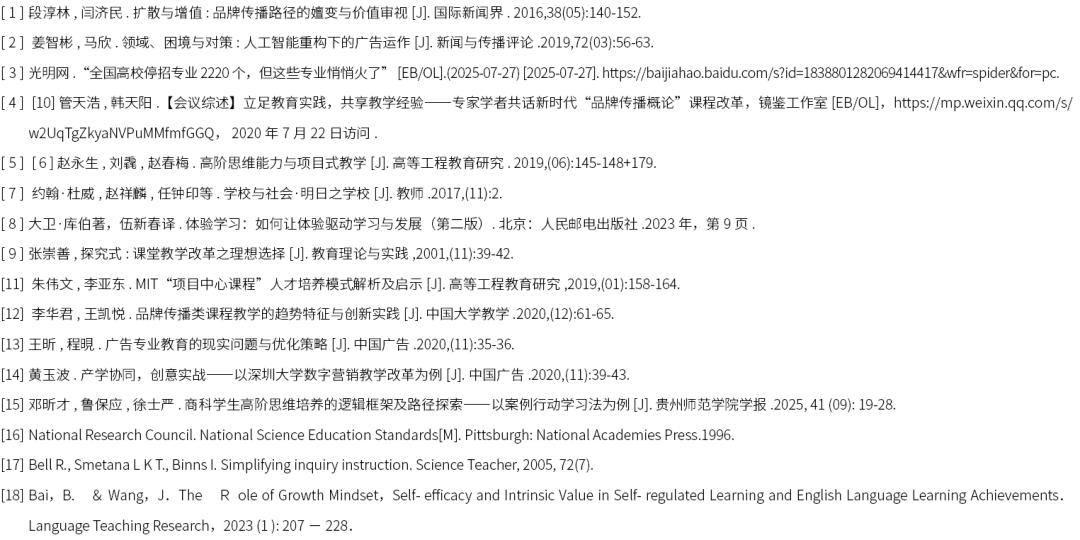 实践表明,该模式有效提升了学生的数据应用与计算思维能力、跨学科整合能力与创造性解决问题能力,其成效已在学生创业项目立项及实习就业中得到验证。受限于样本规模与实践周期,模式的长期适用性仍需进一步检验。未来研究可扩大跨校实践范围,结合不同院校学科特色优化模式设计,并建立动态评估体系,为新文科背景下品牌传播人才培养提供更具普适性的参考,助力教育改革与行业需求的深度衔接。