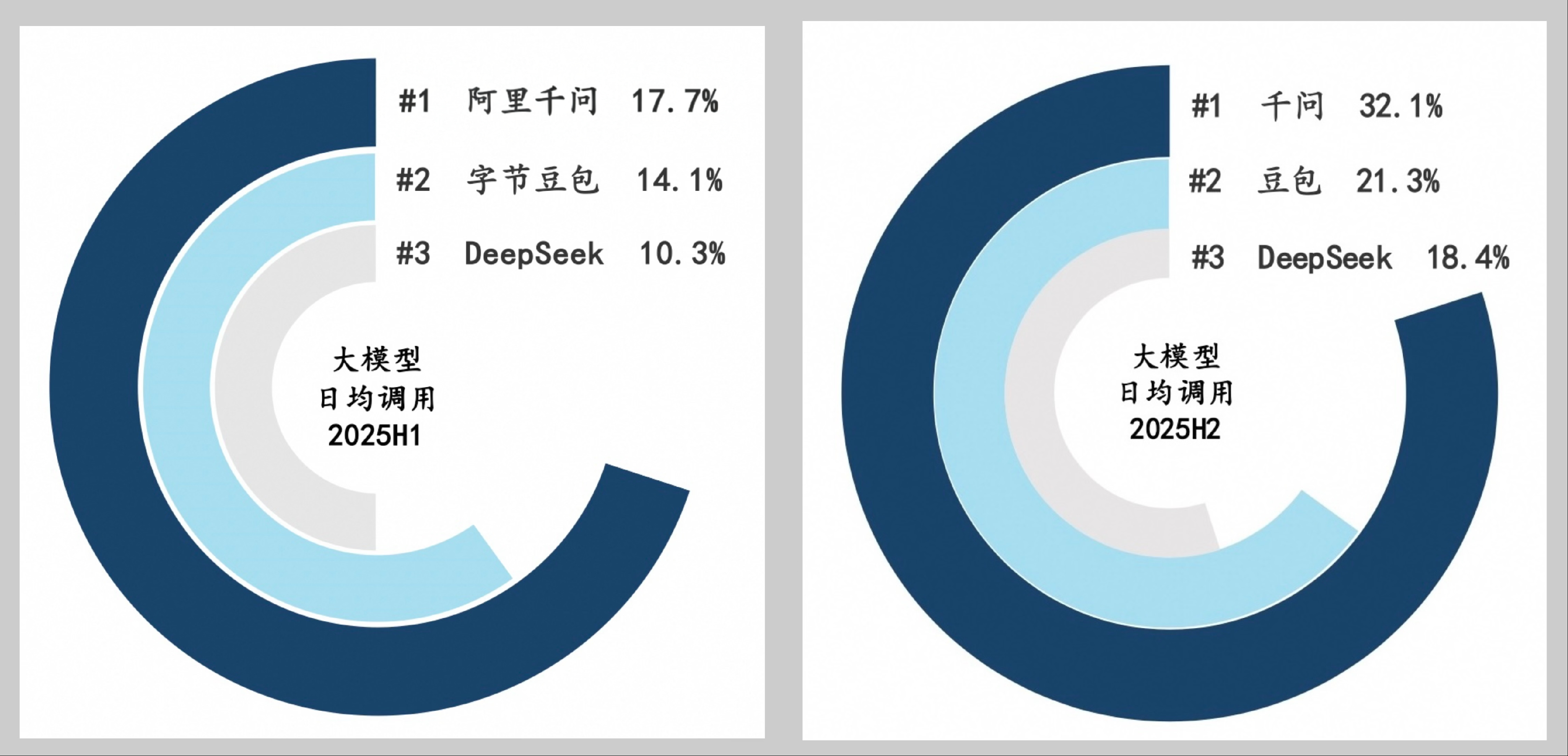 在此背景下,企业级大模型市场正加速向头部厂商集中。2025年下半年,大模型日均tokens消耗TOP3为:千问(32.1%)、豆包(21.3%)和DeepSeek(18.4%)。值得关注的是,2025年上半年,TOP3也是此三家,彼时,三者的占比总和还不到一半;而到下半年,三者占比总和已超过七成。其中阿里云千问的增速更是高达14.4%。