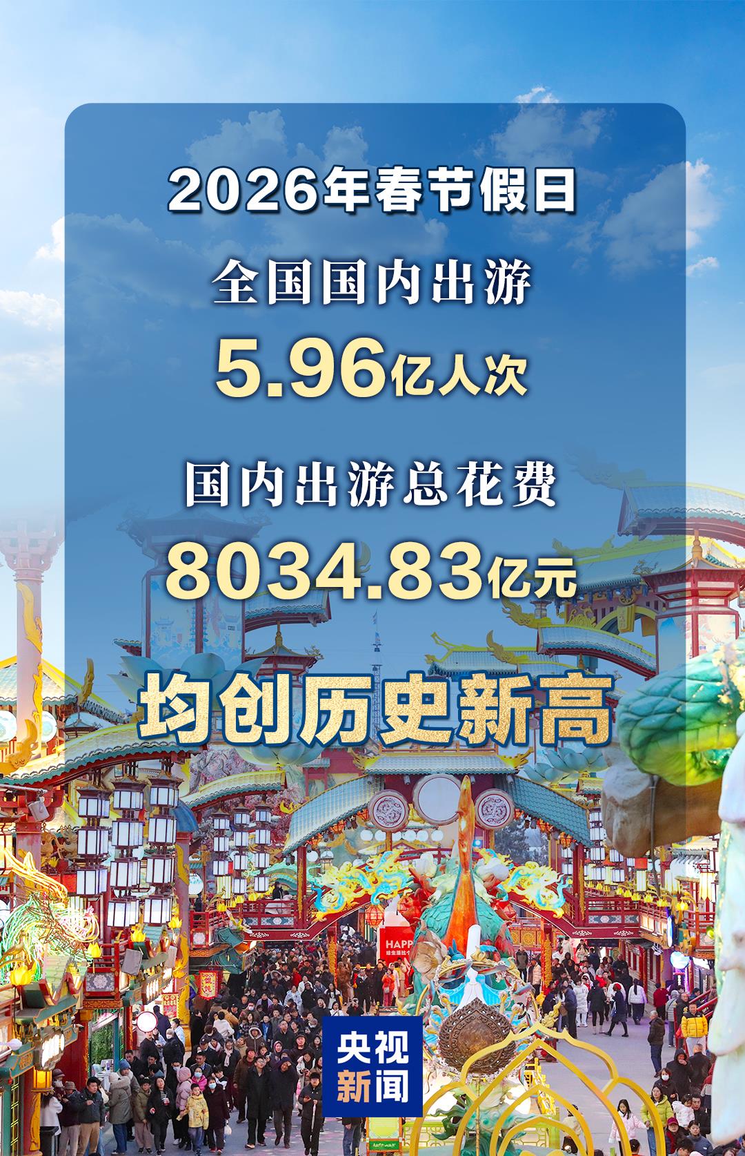 经济观察网 据央视新闻客户端消息,经文化和旅游部数据中心测算,春节假日9天,全国国内出游5.96亿人次,较2025年春节假日8天增加0.95亿人次;国内出游总花费8034.83亿元,较2025年春节假日8天增加1264.81亿元,假日游客人数和花费均创历史新高,全国文化和旅游市场平稳有序。