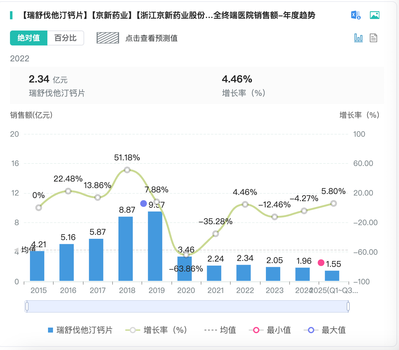 据摩熵医药全终端医院销售额数据,京新药业瑞舒伐他汀钙片销售额从2019年最高峰的9.57亿元骤降至2020年的3.46亿元,此后持续下行,至2025年前三季度为1.55亿元。