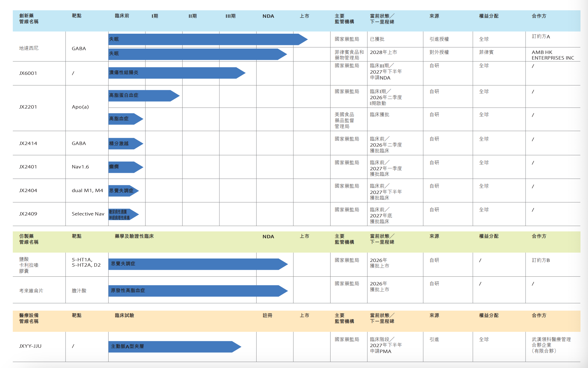 JX2201是一款围绕心血管风险相关热门靶点Lp(a)的候选药。目前尚未有Lp(a)靶点药物获批上市。截至目前,JX2201正在中国开展I期临床试验,预计于2026年第1季度完成I期研究;同时,其II期临床试验方案已在国内获得伦理批准。