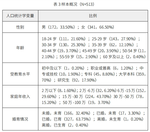 如表 3 所示,本次问卷调研共统计了 513 个样本,其中男性样本为 172,女性样本为 341。从年龄结构来看,多数样本年龄集中在 25 岁至 29 岁、30 岁至 34 岁以及 18 至24 岁,共有 384 名,占总样本的 74.8%。从受教育水平来看,样本基本都接受过高等教育,大学本科学历样本有 359 人,占比 70%。从家庭年收入来看,集中在 15 万至 30 万的样本最多,占比 43.7%。最后,婚育情况上已婚已育样本最多,共有 327 人,占比 63.75%。