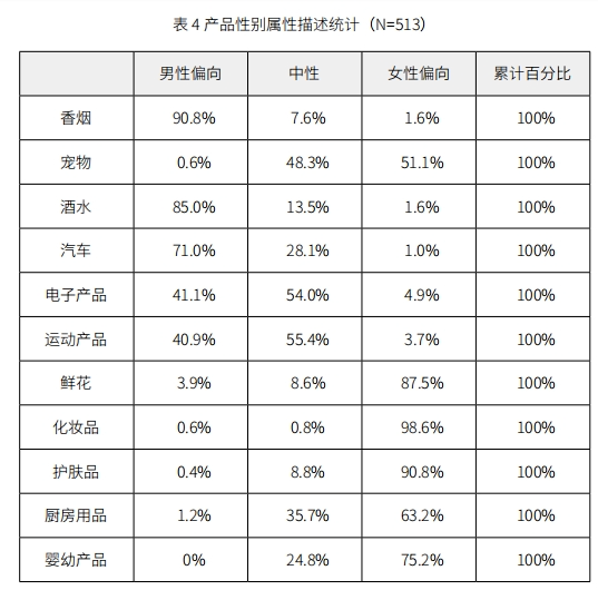 通过统计分析各类产品的性别属性(见表 4),香烟(90.8%),酒水(85.0%),汽车(71.0%),为男性产品。运动产品(55.4%),电子产品(54.0%),宠物(48.3%)为中性产品。化妆品(98.6%),护肤品(90.8%),鲜花(87.5%),婴幼产品(75.2%),厨房用品(63.2%)为