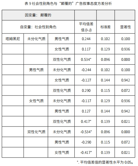 四种性别角色在“颠覆的”性别叙事态度中存在显著差异(p=0.000)。具体而言(见表 9),“未分化气质”显著高于“男性气质”和 “双性化气质”,“女性气质”显著高于“双性气质”,“男性气质”与“女性气质”之间不存在显著差异。