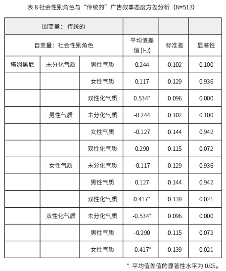 四种性别角色在“传统的”性别叙事态度中存在显著差异(p=0.000)。具体而言(见表 8), 在“传统的”广告性别叙事的态度方面,“双性化气质”与“未分化气质”“女性气质”存在显著差异,且低于后两者。“未分化气质”和“女性气质”之间不存在差异;“男性气质”与其他三种性别气质之间不存在显著差异。
