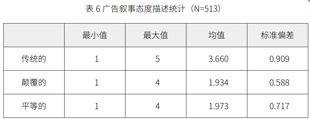 如表 6 所示,“传统的”“颠覆的”“平等的”广告叙事的均值分别为 3.660、1.934、1.973,均值越高表示样本对于广告叙事的态度越消极,由此可知“传统的”广告性别叙事不如“平等的”和“颠覆的”广告性别叙事受欢迎。