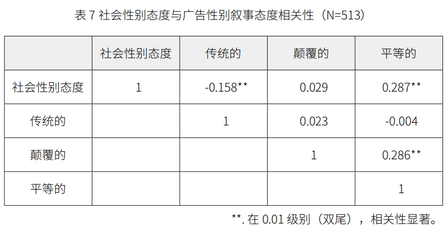 在社会性别态度与三种广告叙事态度之间的相关关系中,社会性别态度与“传统的”和“平等的”显著相关。“传统的”展现的性别定型问题是性别歧视的体现,具有时代落后性;而“平等的”淡化了男女性别之间的对立性,强调双方在身份、地位、责任等方面的对等,是一种进步的性别观念。因此,传统或非传统的社会态度与这两种性别叙事态度之间具有相关性。“颠覆的”相较“传统的”有一定突破和进步性,是性别平等的未完成阶段。因此,对于社会性别态度与“颠覆的”叙事态度之间的相关关系,或许需要融入其他因素来进一步展开研究。这同样反映出,淘汰传统性别观念指导下的营销策略,制定关注性别平等议题策略的重要性。