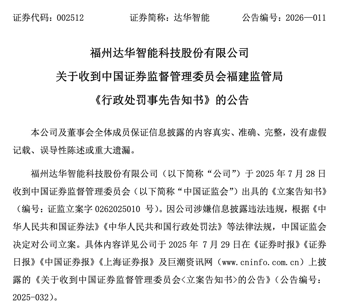 2025年7月28日,达华智能收到中国证监会《立案告知书》,因涉嫌信息披露违法违规被正式立案。七个月后,调查结果以《行政处罚事先告知书》的形式浮出水面。