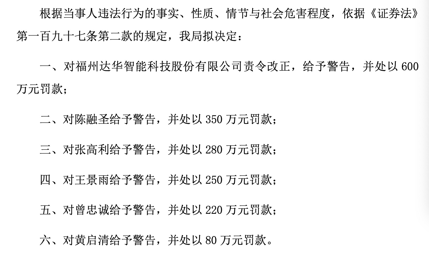 对于上述违法行为,福建证监局拟对达华智能责令改正,给予警告,并处以600万元罚款。同时,六名相关责任人拟被处以警告和罚款,罚款金额合计1780万元。