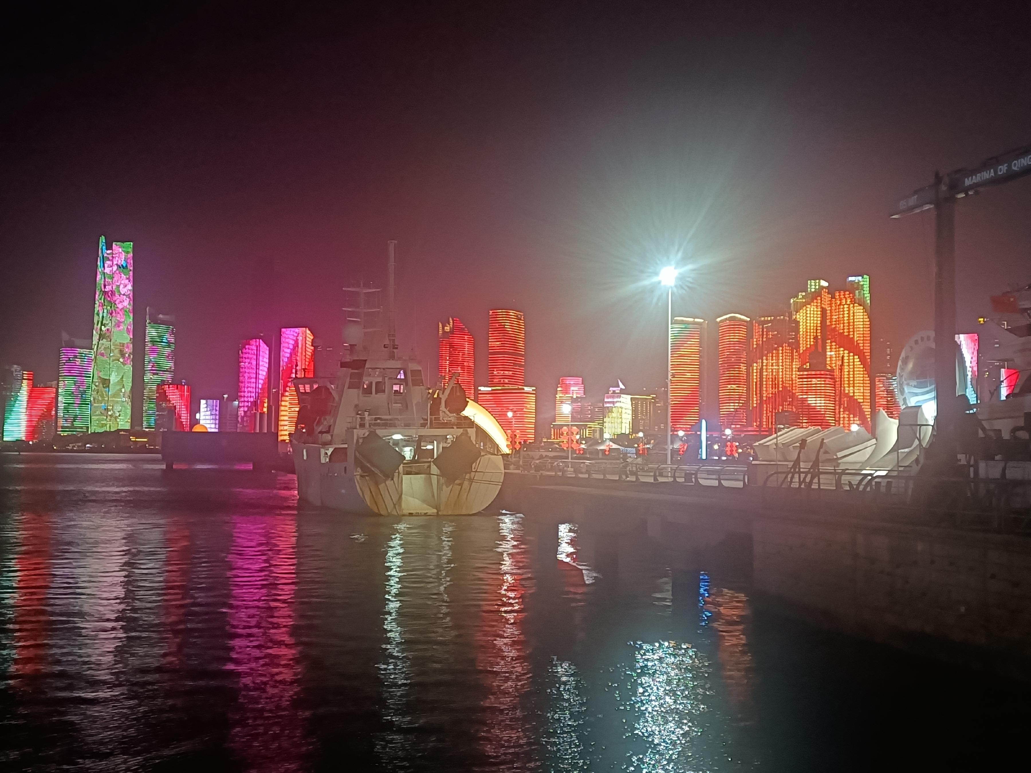 ③霓虹:滨海的高楼大厦,不时打出霓虹灯,五光十色,变换多端,照亮夜空。景色颇为壮观。