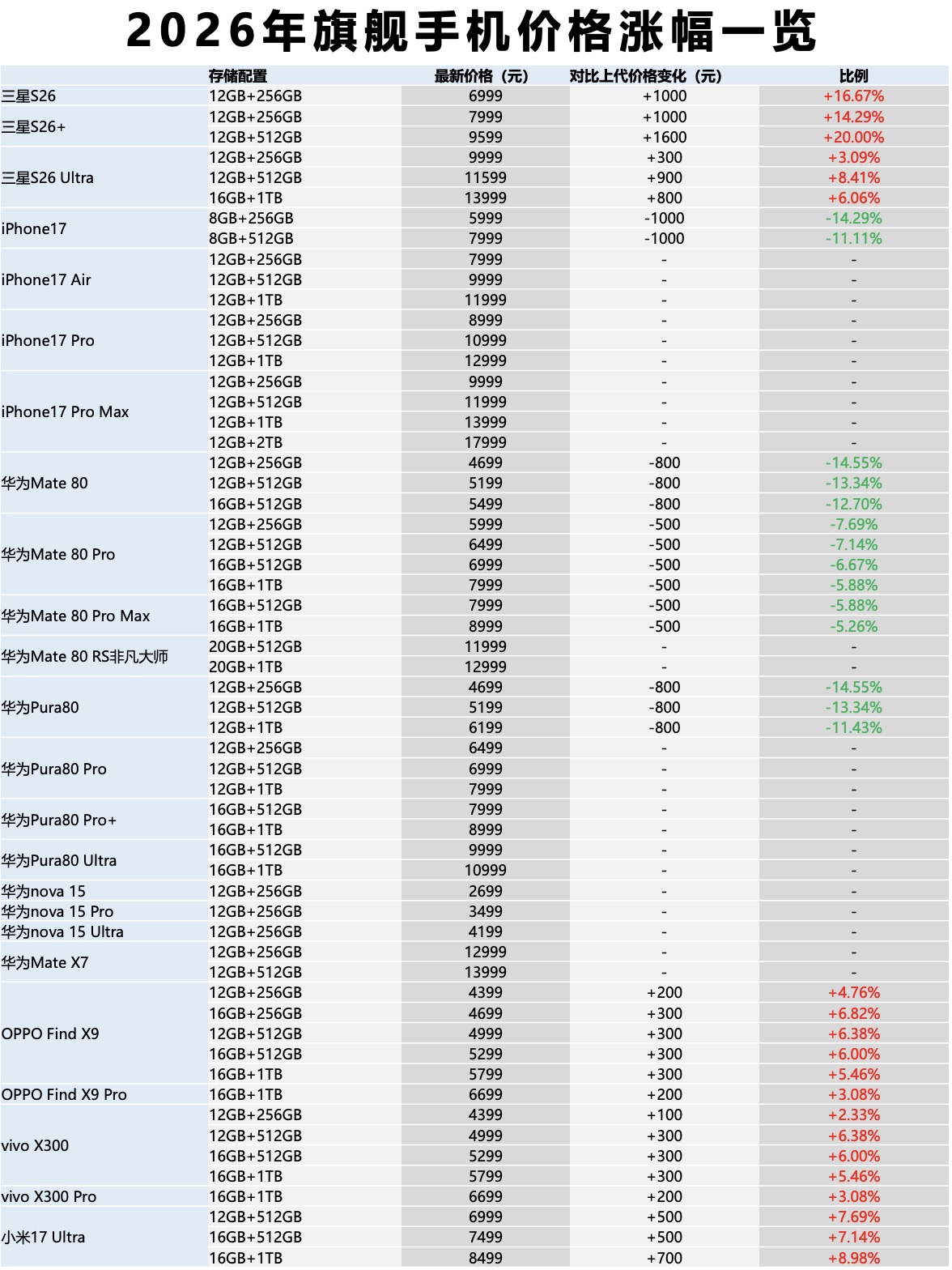 这一共识有明确的市场数据支撑。三星Galaxy S26系列相比上代,售价最高上调1600元;OPPO、vivo、小米、荣耀等国产品牌也较上代均有涨价,涨幅普遍在200至700元之间。然而,华为全系在售机型至今未宣布任何涨价,部分版本仍可叠加国家以旧换新补贴与春节促销权益,这意味着用户仍能以2025年的定价入手高配旗舰。