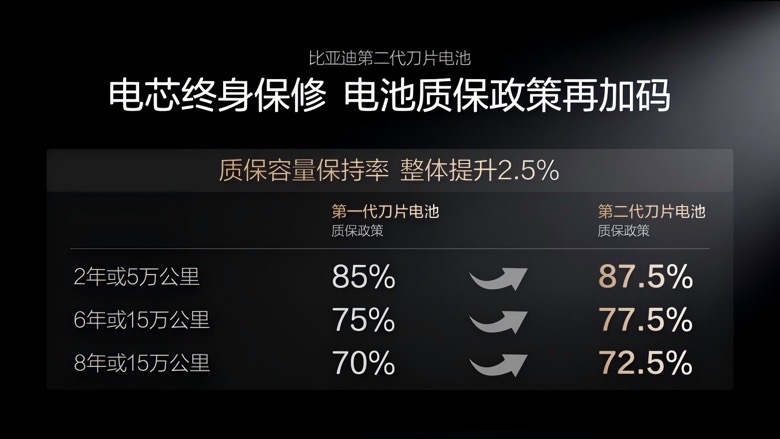 第二代刀片电池通过打造“锂离子高速通道”和“全温域智能热管理系统”,实现了更低的产热和更高效、均匀的散热,让闪充对电池寿命几乎没有影响。基于这样的底气,比亚迪还宣布电池质保政策再加码!第二代刀片电池质保的“容量保持率”整体提升2.5%,电芯依旧是“终身保修”,这就是第二代刀片电池,给所有用户的安心承诺。