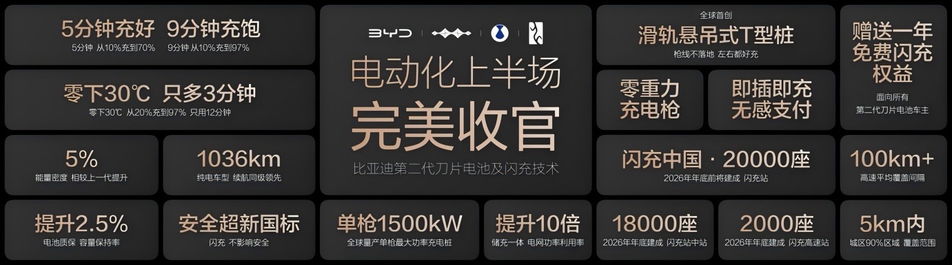 第二代刀片电池及闪充技术的发布,与“闪充中国”战略的落地,标志着 “充电慢”、“低温充电难”这两大世界性难题已被攻克,新能源汽车电动化的“上半场”至此完美收官。