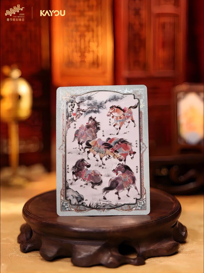 作为春晚历史上首个独家卡牌合作伙伴,卡游配合马年主题,与央视共同推出了2万套“骐骥驰骋典藏卡”贺岁版礼盒。这套卡牌将“西汉马踏匈奴”石刻、唐代昭陵六骏等文物元素绘于卡面,配以相关诗句,把传统意象凝缩进八张方寸卡片之中,让卡牌与新春的吉祥意境自然相融。