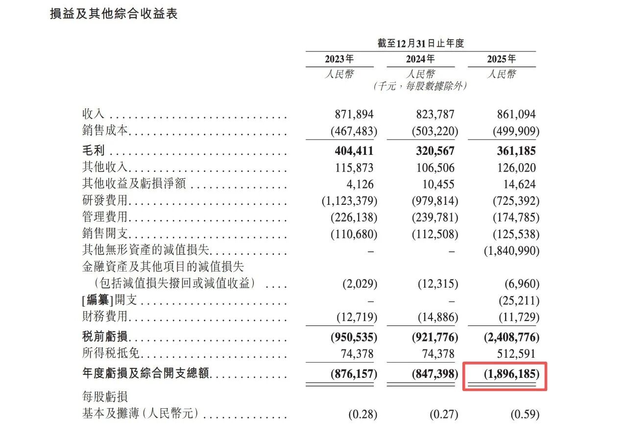 2023年至2025年,公司收入分别约8.7亿元、8.2亿元和8.6亿元,整体处于横盘区间。相比之下,亏损规模却持续扩大,2025年净亏损接近19亿元。