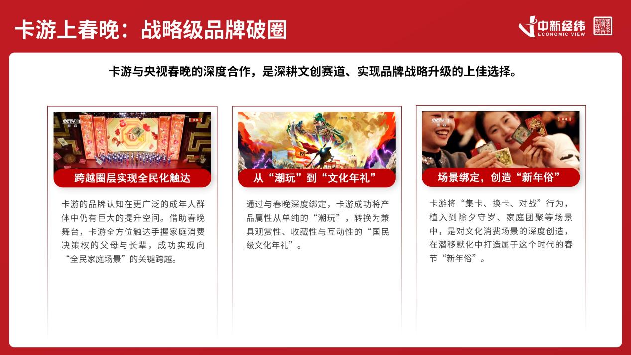 而依托春晚的强大国民级影响力,赞助品牌也可以实现战略级品牌破圈。《报告》以卡游为例分析指出,借助春晚舞台,卡游全方位触达手握家庭消费决策权的父母与长辈,成功实现“全民家庭场景”的关键跨越。通过与春晚深度绑定,卡游成功将产